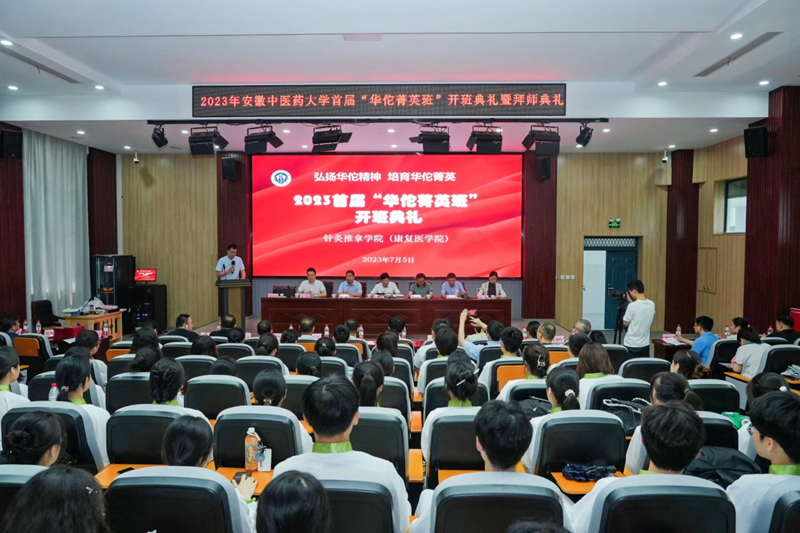 中安在线、中安教育网讯 7月5日下午,安徽中医药大学针灸推拿学院(康复医学院)首届“华佗菁英班”开班暨拜师典礼在少荃湖校区举行。安徽中医药大学校长彭代银出席开班典礼并讲话,该校2023年首届“华佗菁英班”导师代表、“华佗菁英班”全体学生参加开班典礼。