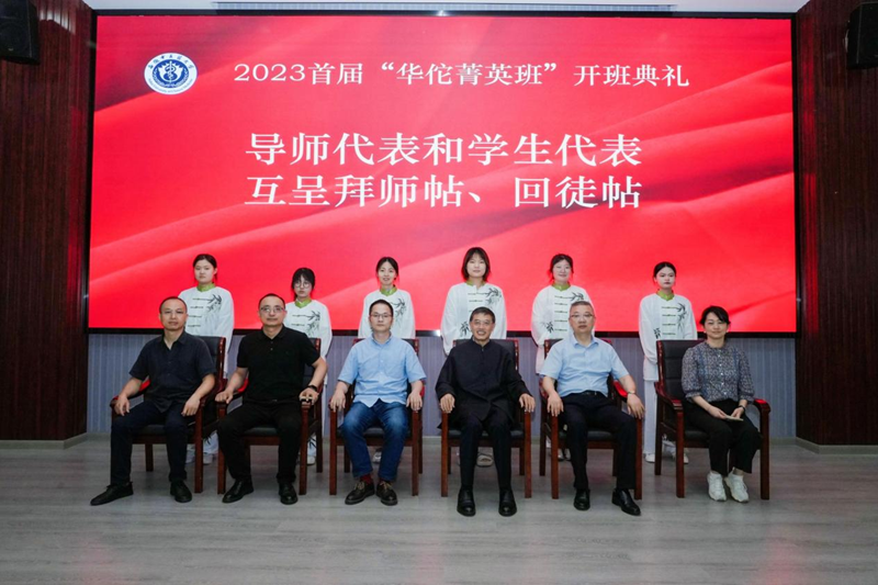 开班仪式结束后,举行了传统、庄重、简朴的拜师典礼。“华佗菁英班”导师代表和学生代表,依次互呈拜师帖、回徒帖,导师将中医经典装入特别设计的“华佗青囊”里,寓意将精诚品德和知识技艺“倾囊而授”,希望弟子们传承华佗衣钵,成为未来针灸推拿行业的青年主力军。(孙梦珠 唐巍/文图 )