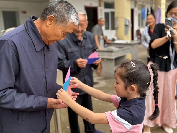 随后,每个小朋友都勇敢地走到老人面前,给他们深深地鞠上一躬,送上送上牛奶、水果和自己亲手做的贺卡。一位爷爷笑着说:“这些孩子比自家孙辈还亲,心里暖暖的”,看着老人们脸上的笑容,孩子们也露出了满足的神情。