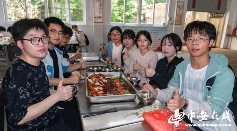 捞出来的鱼随后交由学校食堂统一进行加工,制成了红烧鱼块、肉烧豆腐、炒青菜等美味菜品,全部采用一次性餐具打包并搭配米饭,免费发放给高三全体学生,确保每人都能品尝到这份劳动成果。