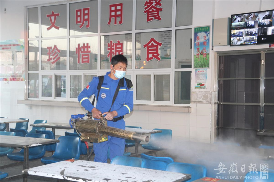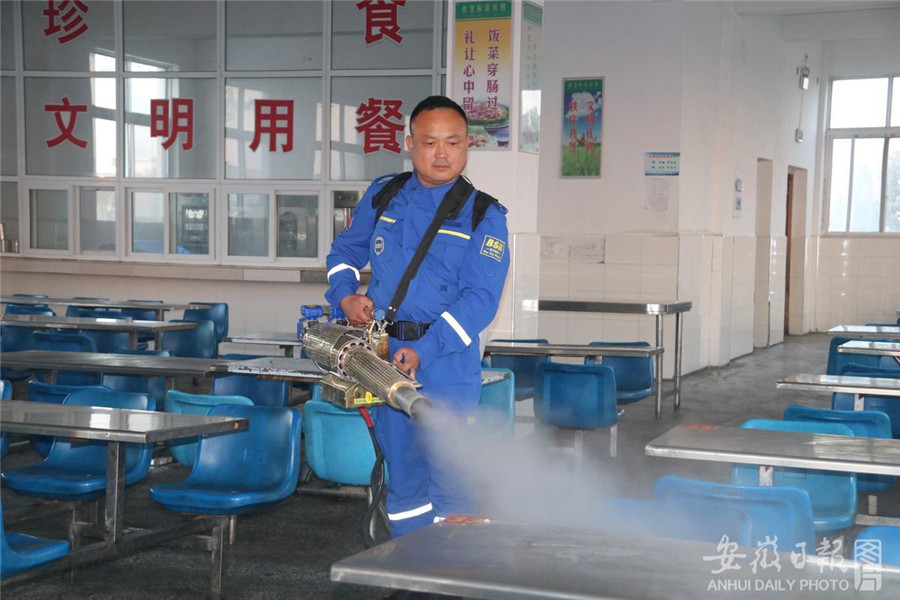 2月20日,阜南蓝天队员在田集镇中心幼儿园进行消杀作业。开学在即。连日来,阜南县各中小学幼儿园组织人员开展校园消杀防疫工作,营造安全卫生的校园环境,为新学期开学做好准备。通讯员 田鋆生 摄