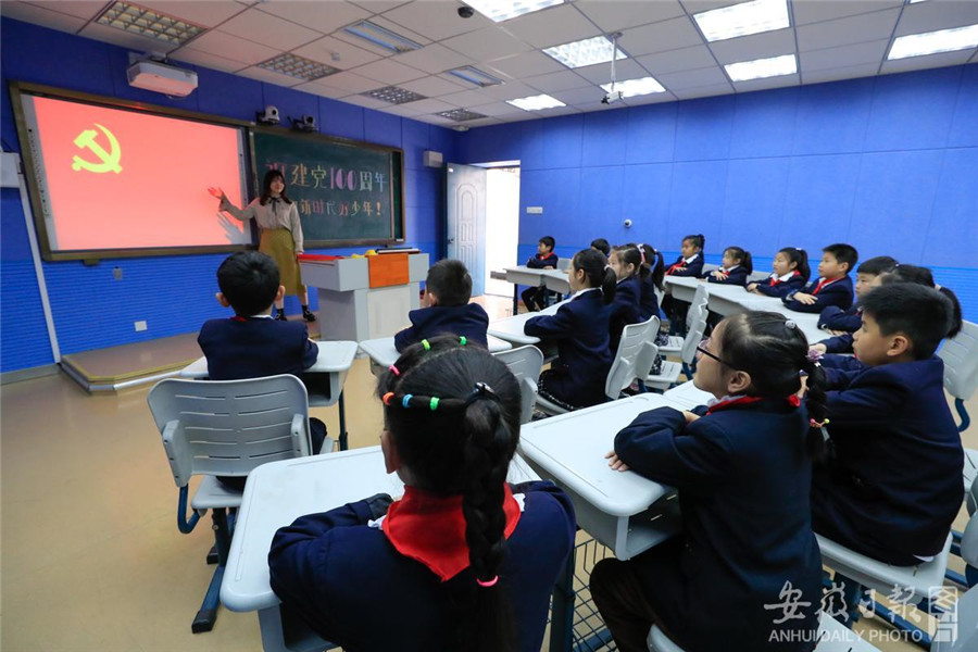 4月13日,合肥庐阳区林店街道南门小学恒盛皇家花园校区老师正在对学生们开展“童心向党,争做共产主义接班人”主题思想政治课,引导学生了解党史知识,争做时代好少年。通讯员 赵明 摄