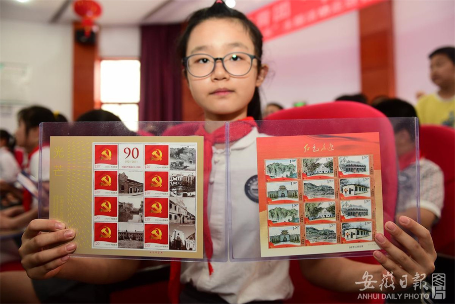 近日,在合肥市逍遥津小学金都校区,学生展示社区党委赠送的红色邮票。为庆祝中国共产党建党100周年,引导学生学党史、感党恩、跟党走,当日,合肥市庐阳区杏花村街道金都社区联合逍遥津小学金都校区开展“红色邮票进校园”活动,社区党委为学生代表们每人赠送了两版见证我党历史发展的红色邮票,社区党员志愿者、新乡贤为学生分享红色邮票中的党史故事,让学生感受幸福生活的来之不易,珍惜美好生活,努力学习报效祖国。