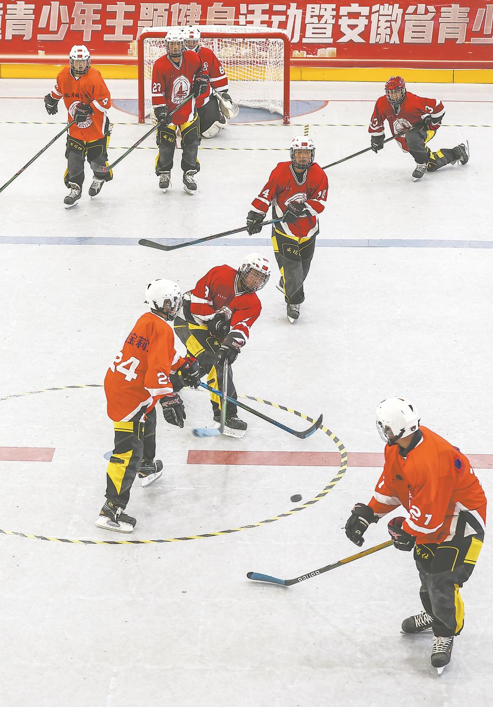 2021年12月25日,在位于合肥市蜀山区凯旋门社区的冰纷万象滑冰场,一场冰球对抗赛正在激烈上演。