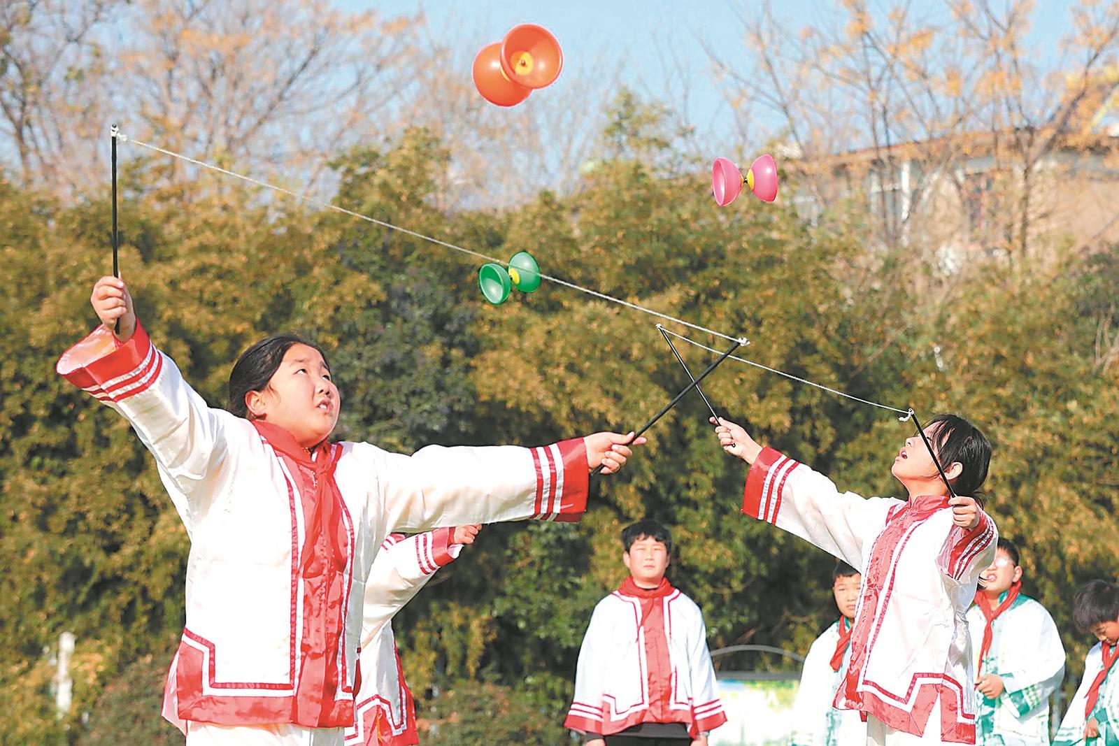 12月8日,淮北市相山区刘桥矿小学开展丰富多彩的阳光体育大课间活动,学生们在练习五禽戏、抖空竹、滚铁环、踢毽子等传统体育项目中乐享课间运动快乐。通讯员 万善朝 摄